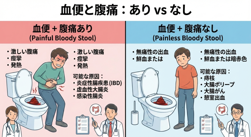 「腹痛の有無」は、病変が急激な炎症(火事)か、静かな組織破壊(浸食)かを見分ける最大のサインです。