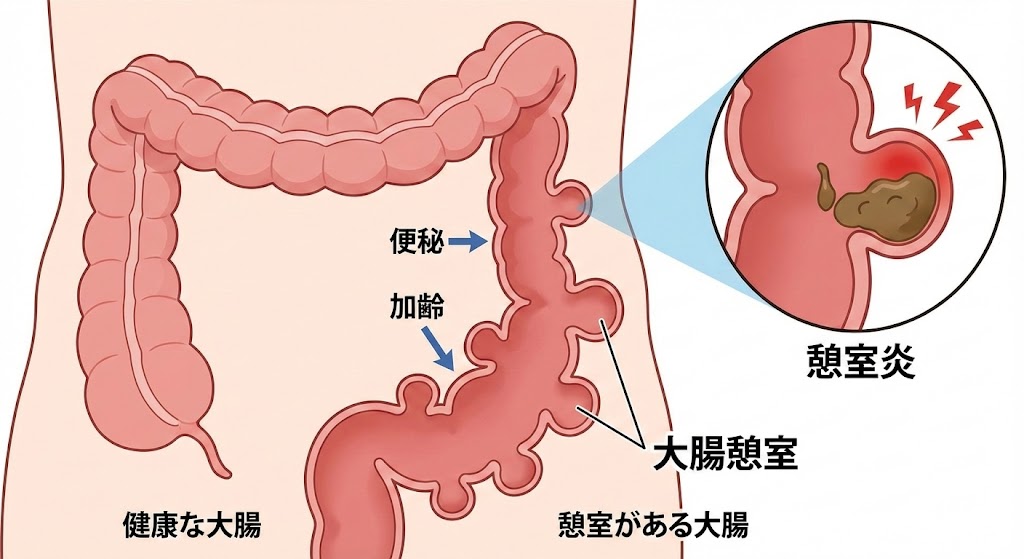 - 原因: 腸壁のくぼみ(憩室)にある血管が破れるためです。